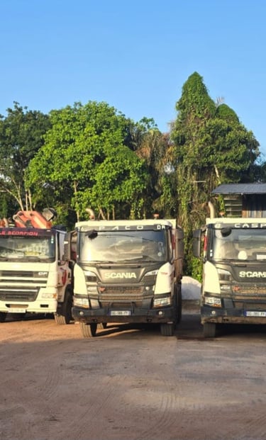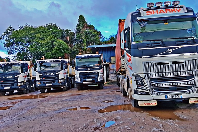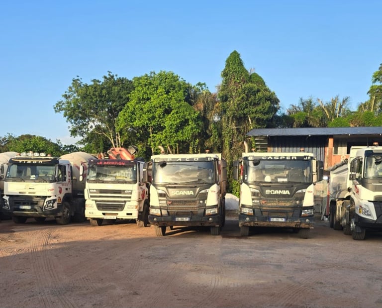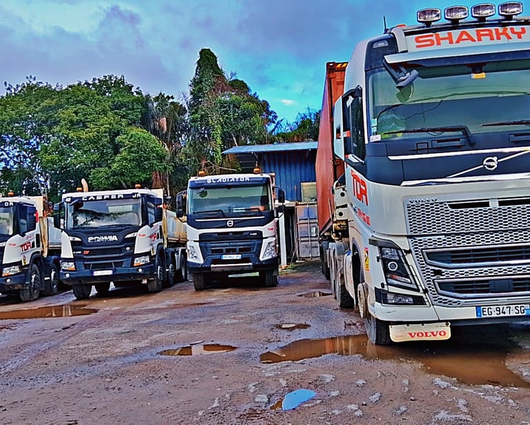 Tous nos transports, qu'ils soient de containers, de matériaux ou de matériels sont effectués par des chauffeurs qualifiés avec des camions poids lourds dédiés (porte-container, toupie béton, bennes, grue, ampliroll ...). Nous intervenons sur tout le territoire guyanais et même au Suriname.